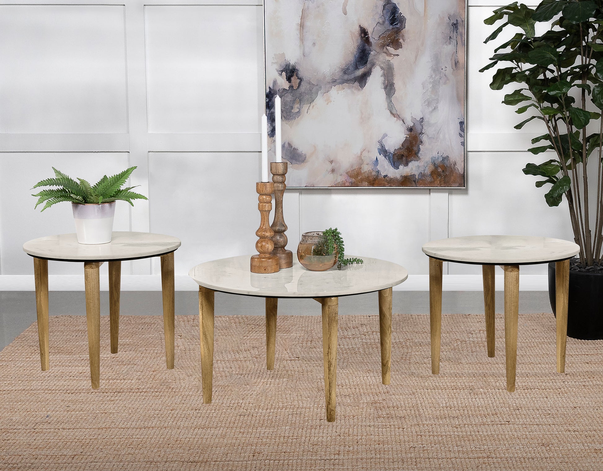 Elevate your living room with this coffee table set, combining a round coffee table and matching end table for a cohesive, natural aesthetic. Crafted with genuine white marble tops, each piece features unique veining that adds artisanal charm. The solid mango wood legs, finished in a natural tone, provide sturdy support and showcase organic grain patterns. Handcrafted in India, this set blends seamlessly with modern, minimalist, or rustic decor. Its earthy tones and durable materials ensure both style and longevity.