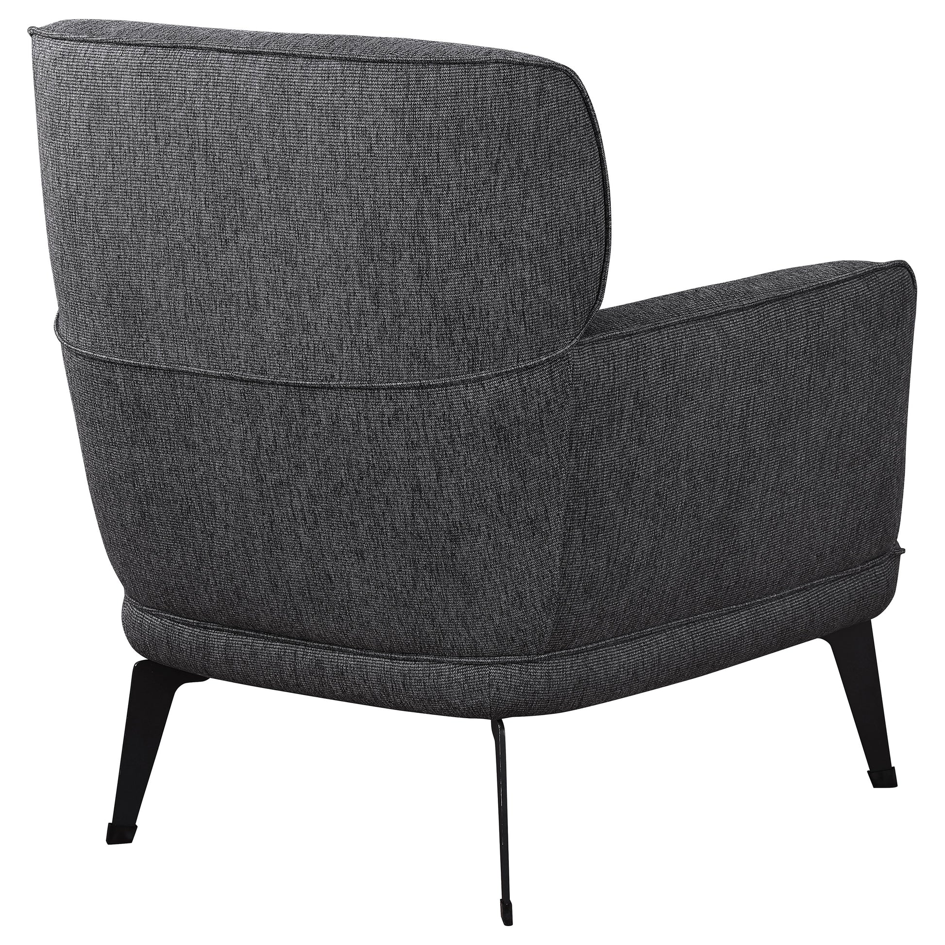 Check all the boxes for a comfortable and stylish addition to your living space. This chic accent chair reflects the best of both modern and transitional style elements. Gorgeous upholstery covers a chair made of wood products and padded with foam to create a luxurious seating experience. Rounded track arms and a deep non-removable seat cushion embellish the design of a chair that coordinates with a sleek seating group or sits alone in a library or bedroom. Set atop chic black metal legs, this chair becomes a favorite spot for stylish relaxation.