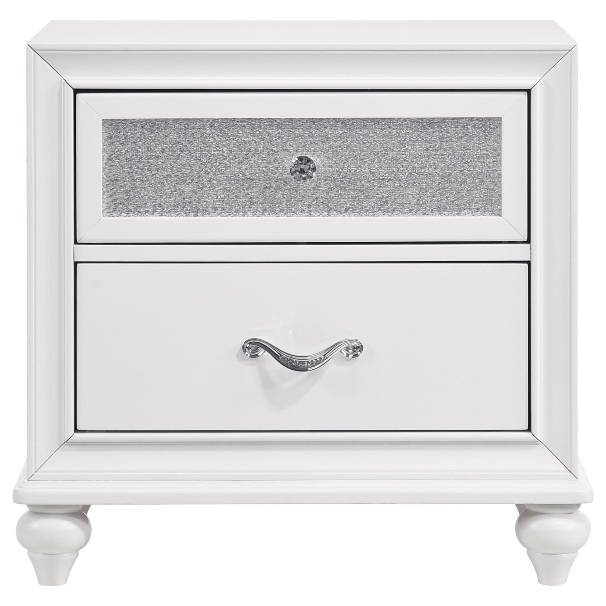 Transform your bedroom into a glamorous retreat with this elegant set. The design highlights a dramatic wingback headboard upholstered in soft white velvet, adorned with sparkling crystal tufting and outlined in chrome nailhead trim. Coordinating details feature glittery acrylic panels, faceted crystal hardware, and sculpted bun feet, all tied together with a crisp white finish. Built with solid rubberwood, engineered wood, and okume veneer, this collection blends durability with radiant modern style.