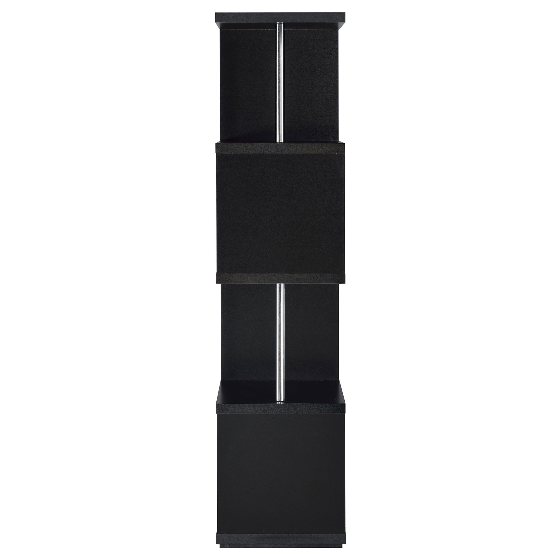 • Modern cube-style bookshelf in black finish with chrome metal rod accents