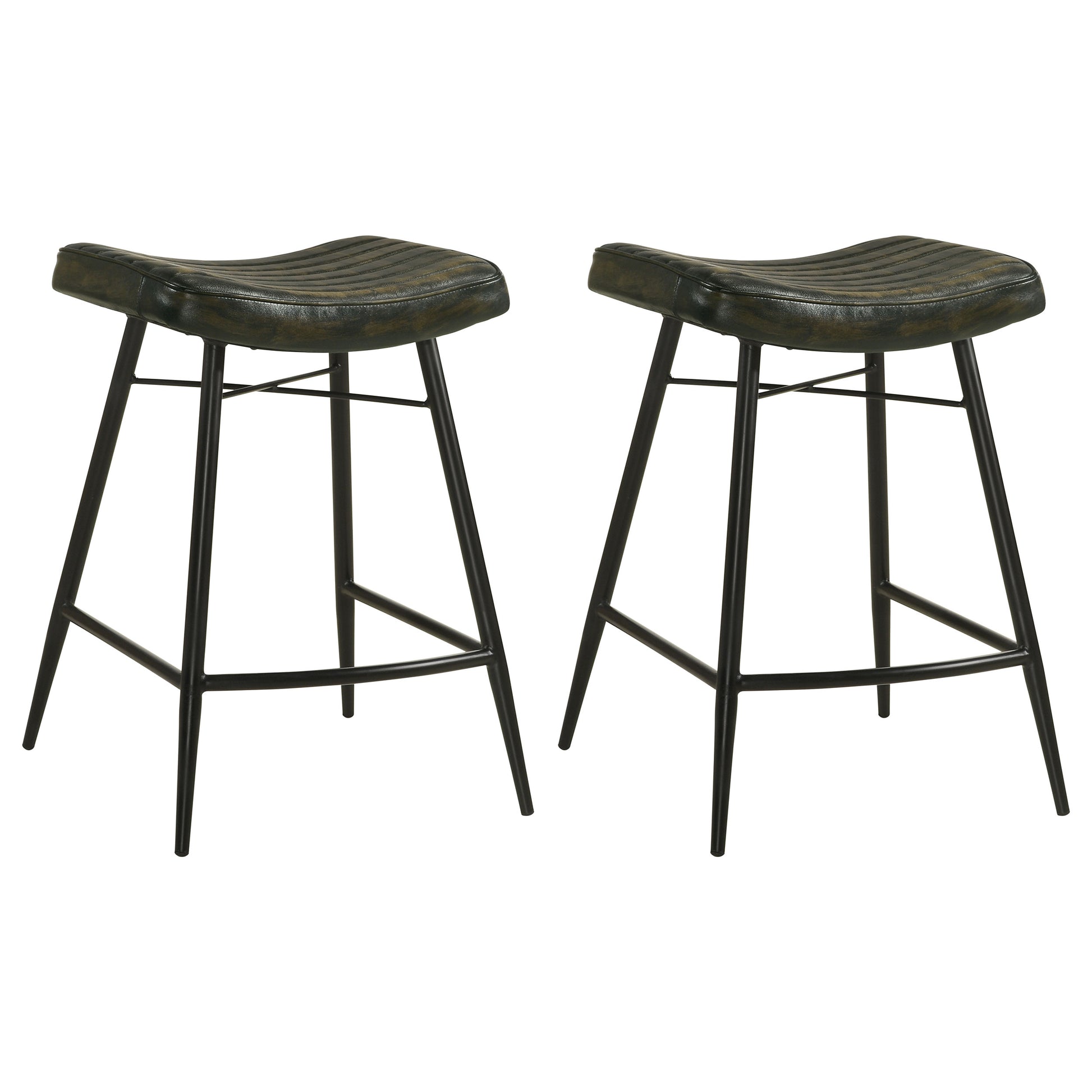 Inject a heavy dose of casual character to your kitchen or bar with the rich antiqued leather upholstery featured on a classic backless stool. Its gently curved seat cradles you in comfort, with channel tufting that adds texture and compelling style. A durable metal base delivers stability for all your seating needs, from a quick cup of coffee in the morning to a leisurely dinner catching up with your favorite person. Flared legs define its silhouette, with an X-cross brace just under the seat adding visual interest and depth. Gently curved footrests and built into the base, perfect for support and style for the whole family.