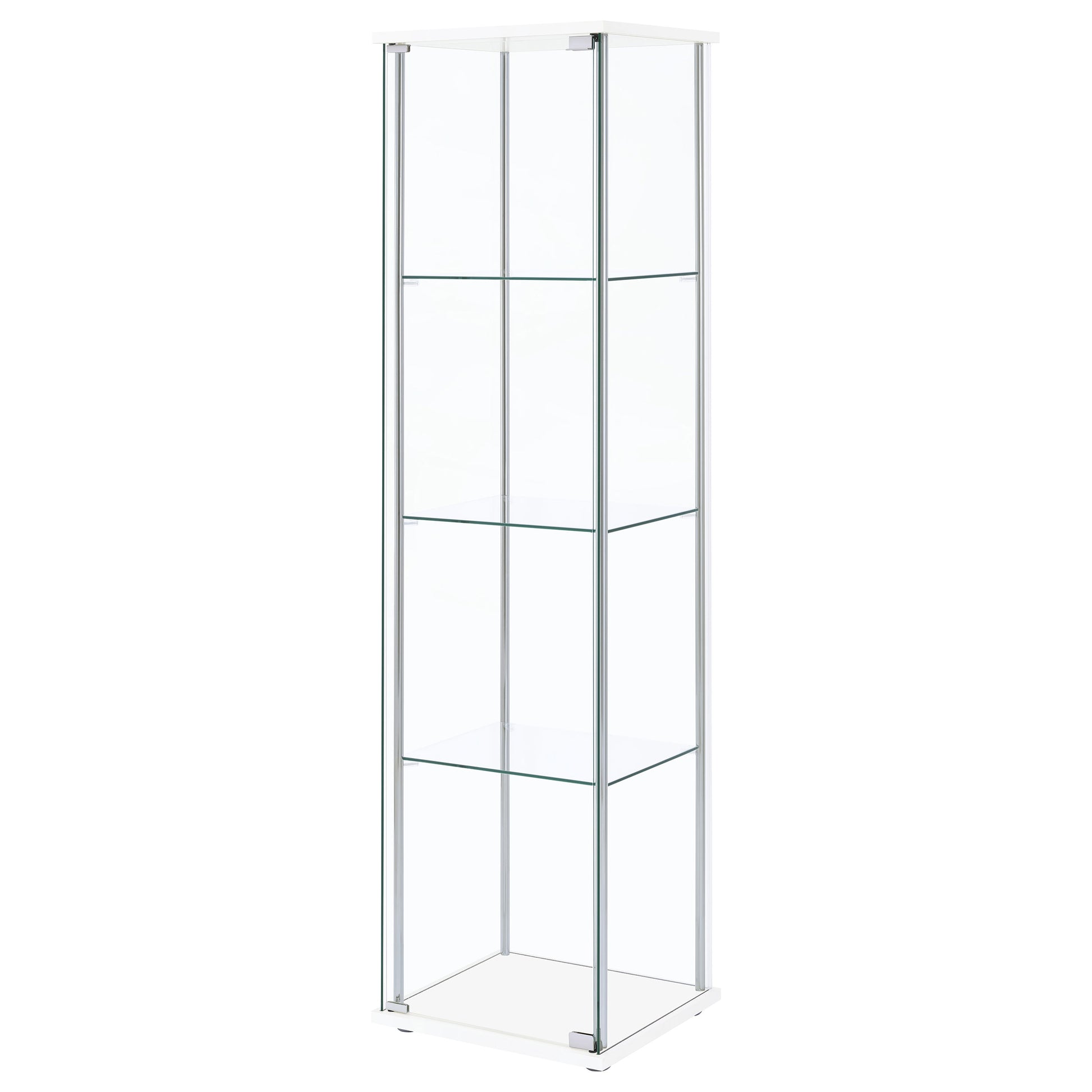 • White finish curio cabinet, rectangular top and base, chrome supports, tempered glass shelving