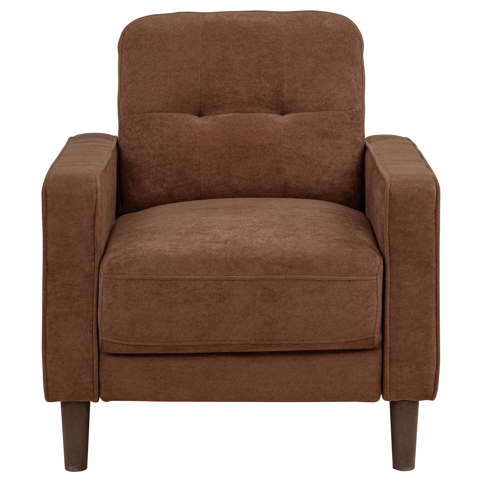 This modern accent chair brings cozy scale and crisp structure to any compact space. Wrapped in soft, textured upholstery, it features slim track arms with cord welt trim and a grid-tufted back for tailored charm. A pocket coil seat offers long-lasting comfort, while tapered round legs provide a stable, elevated base. Perfectly sized for apartments, bedrooms, or reading nooks, this chair delivers a refined yet inviting presence.