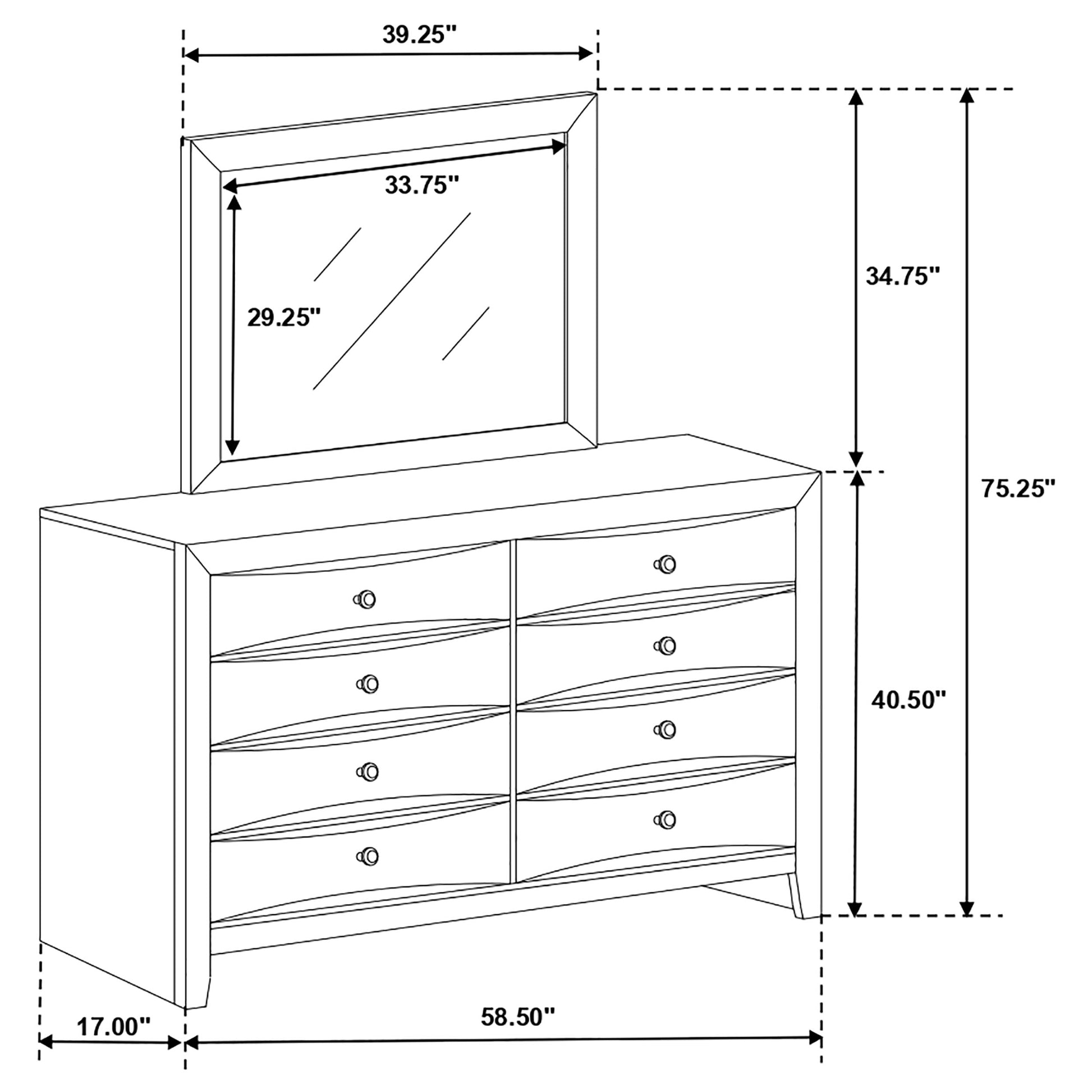 Add elegance and storage to your bedroom with this eight-drawer dresser and matching mirror set. Finished in a sleek black tone, the dresser features chambered drawer fronts and brushed nickel hardware that bring depth and sophistication. Its spacious drawers glide smoothly to store clothing and accessories, while the framed mirror enhances balance and light within the room. Crafted from rubberwood, engineered wood, and okume veneer, this dresser and mirror pair offer enduring quality and timeless style.