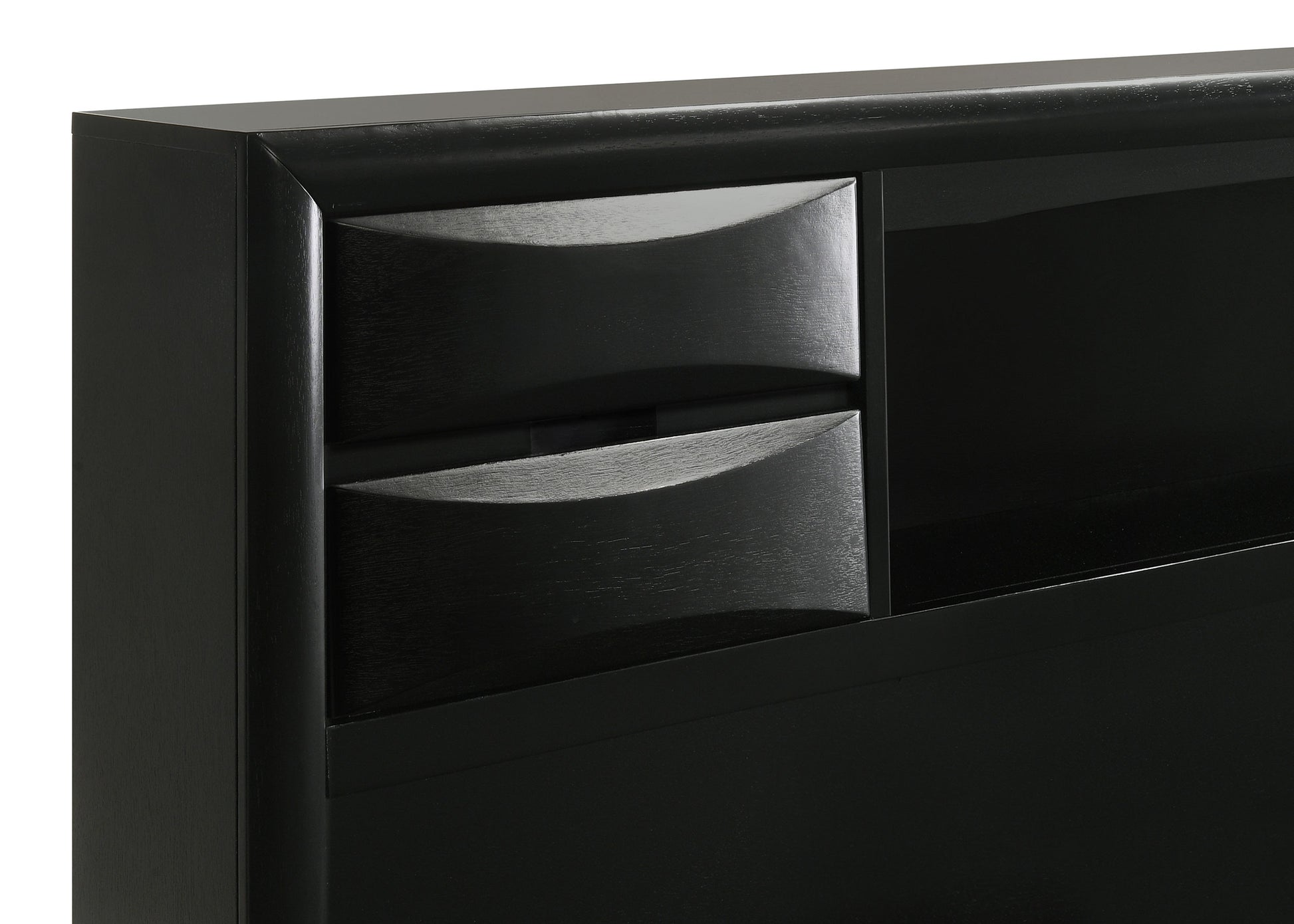 • Four drawers and open shelves in headboard for everyday items
