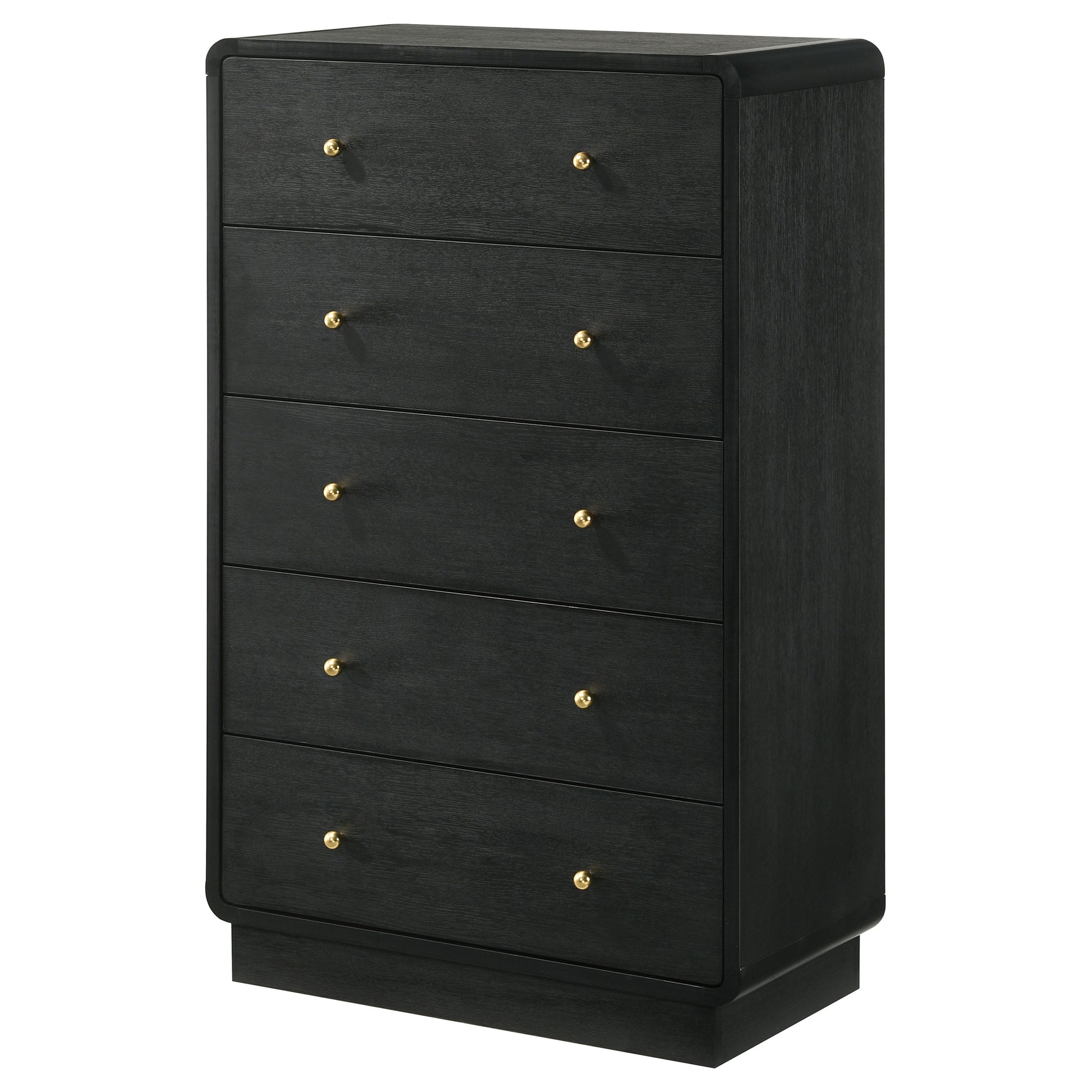 Create a dedicated space for clothing and accessory storage with this modern five-drawer chest. Its sophisticated presentation is complemented with a black finish over durable melamine surfaces, resisting damage to maintain its fresh, clean aesthetics. Each drawer front is dotted with a pair of ball knobs, offering seamless performance and a refined, glam touch of character. The chest features a rounded silhouette, softening the dark black finish, while adding to its modern appeal. Add art to its roomy top to create a truly eye-catching accent piece in your bedroom.