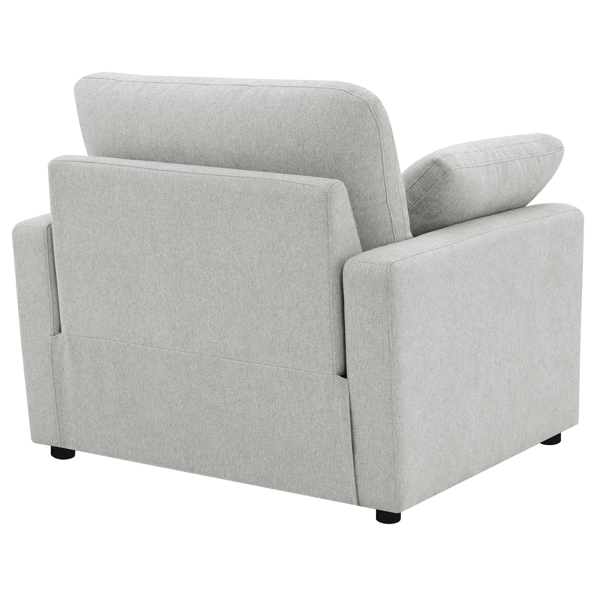 • Upholstered in coordinating dark grey fabric for a modern aesthetic