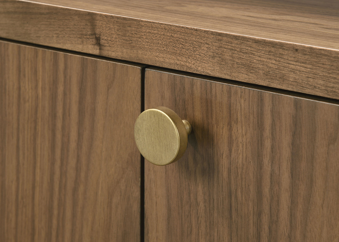 • A walnut finish highlights the wood grain details and round metallic knobs of the sideboard