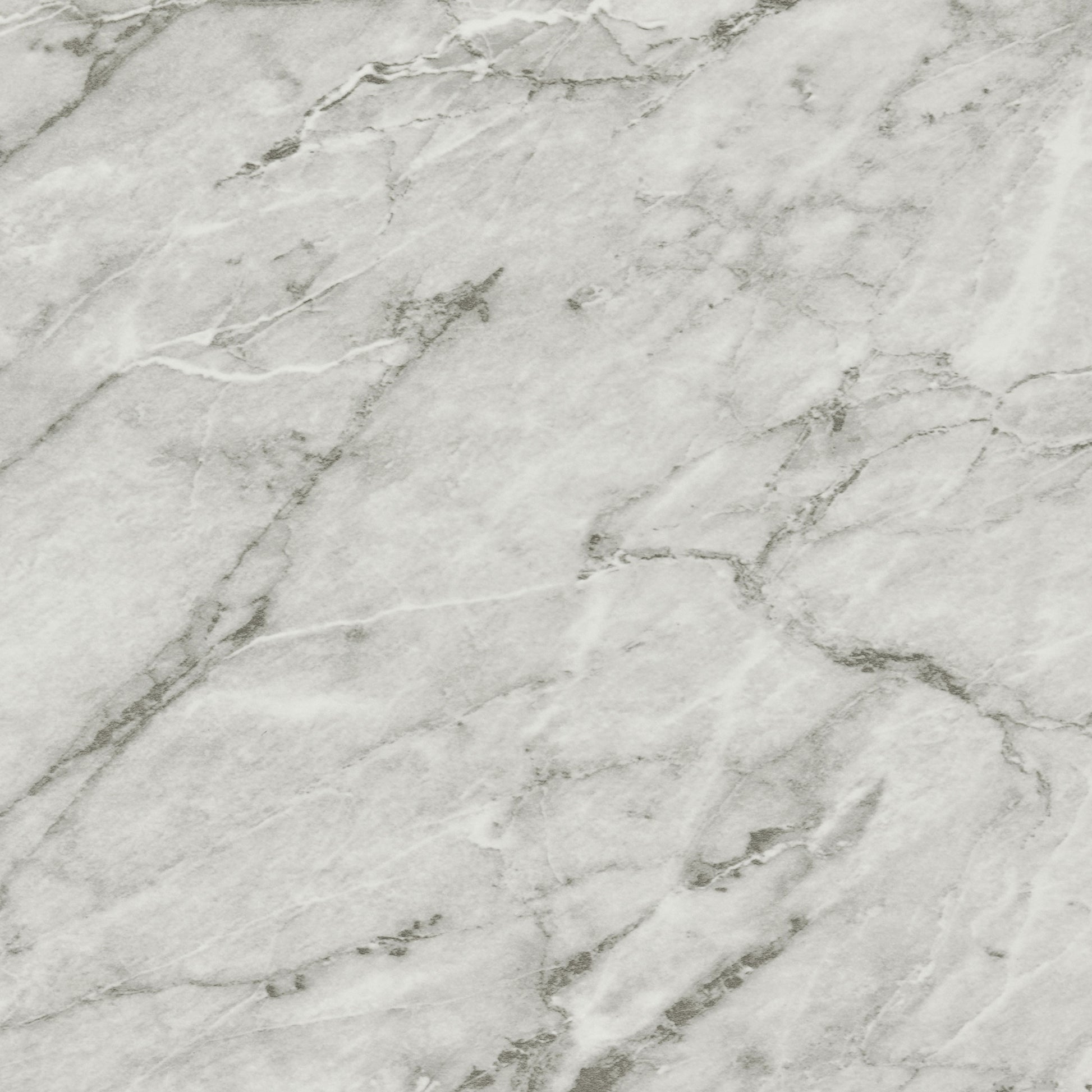 • Faux white marble shelves with rounded edges lend a traditional vibe