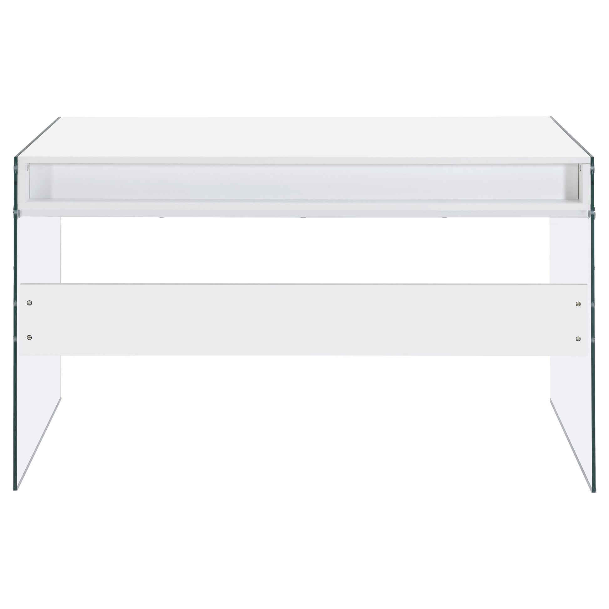 With its cool, contemporary appeal, this versatile writing desk works well in a bedroom or living room. It creates a functional space to work and study without sacrificing style. Bold, thick, tempered glass panels form its base supports, giving it an inspired touch of glamour. Its striking aesthetic is brought to life with a finish of glossy white. This desk is complete with an open center compartment and two drawers, adding extra convenience while maintaining its sleek look.