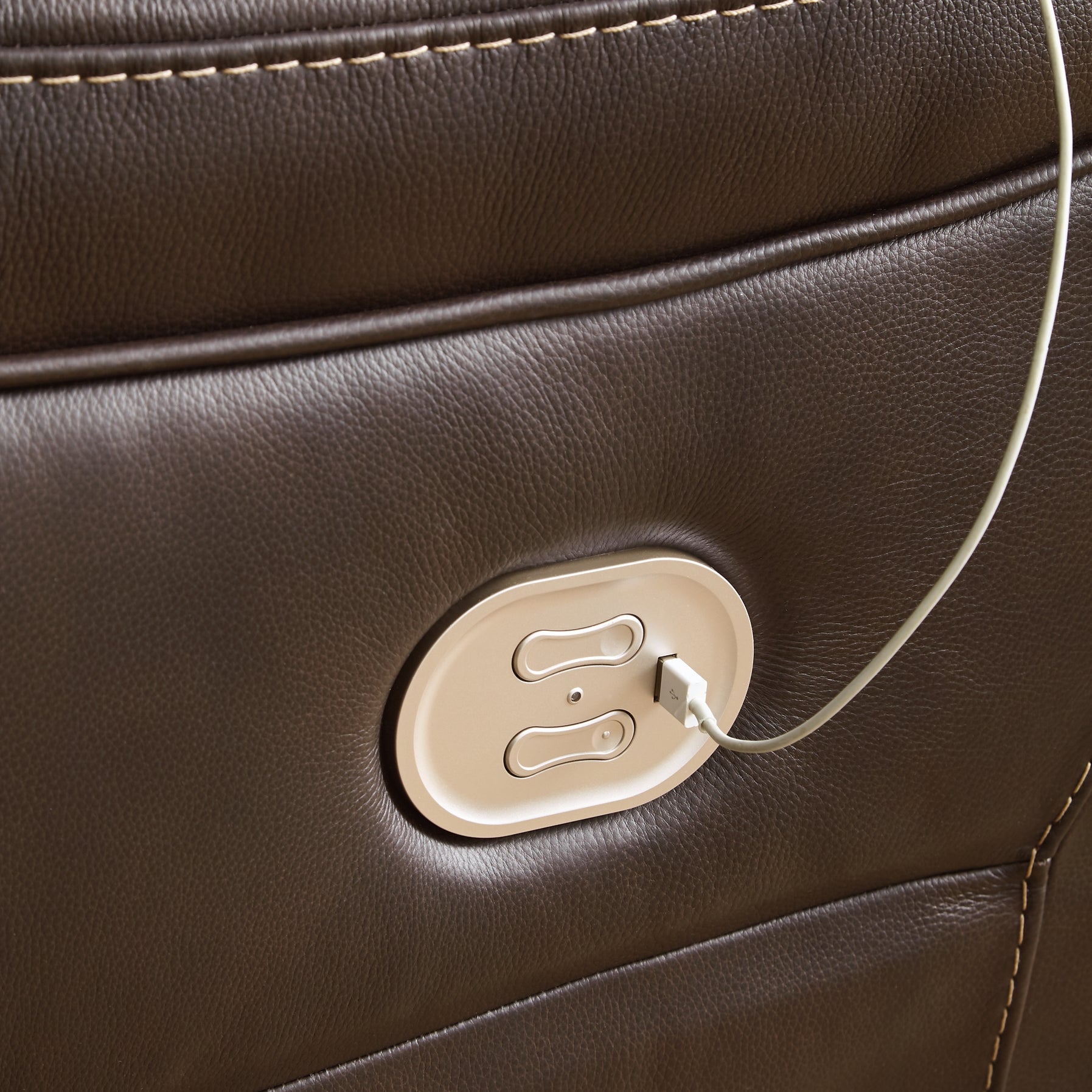 Load up on comfort in a cool, clean-lined and contemporary way with this power reclining sectional in chocolate brown. Rest assured, the expertly matched leather and faux leather upholstery is enriched with a pebble grain effect for authentic appeal and enhanced with jumbo stitching for dramatic contrast. It features a one-touch power control with adjustable positions, along with an Easy View™ adjustable headrest that allows a primo view of the TV even when you're reclined. Extended ottomans provide extra length for leg comfort. A zero-draw USB plug-in at your fingertips lets you charge up as you chill out.