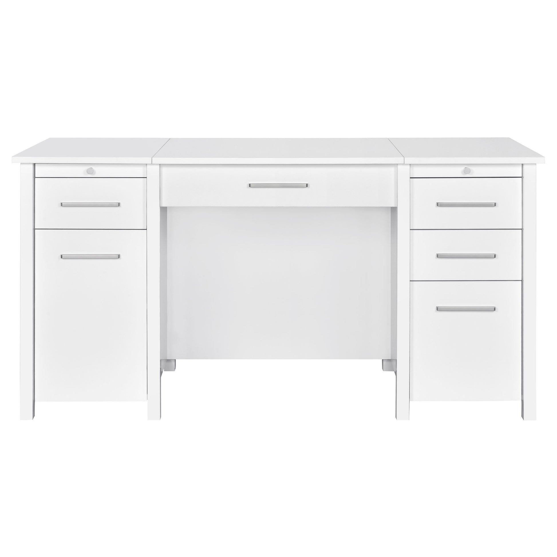 Create the perfect ergonomic home office setup with this contemporary lift top office desk. A smooth surface all around, this contemporary desk features clean lines and plenty of space for work or study. Spacious drawers help organize office files and essentials, each one fastened with a sleek pull in a shiny brushed zinc finish. Need extra writing space or a place to keep coffee nearby? This clever desk features two pull-out trays, one on each side. Extra touches like smooth ball bearing glides and soft-close glides offer modern upgrades.