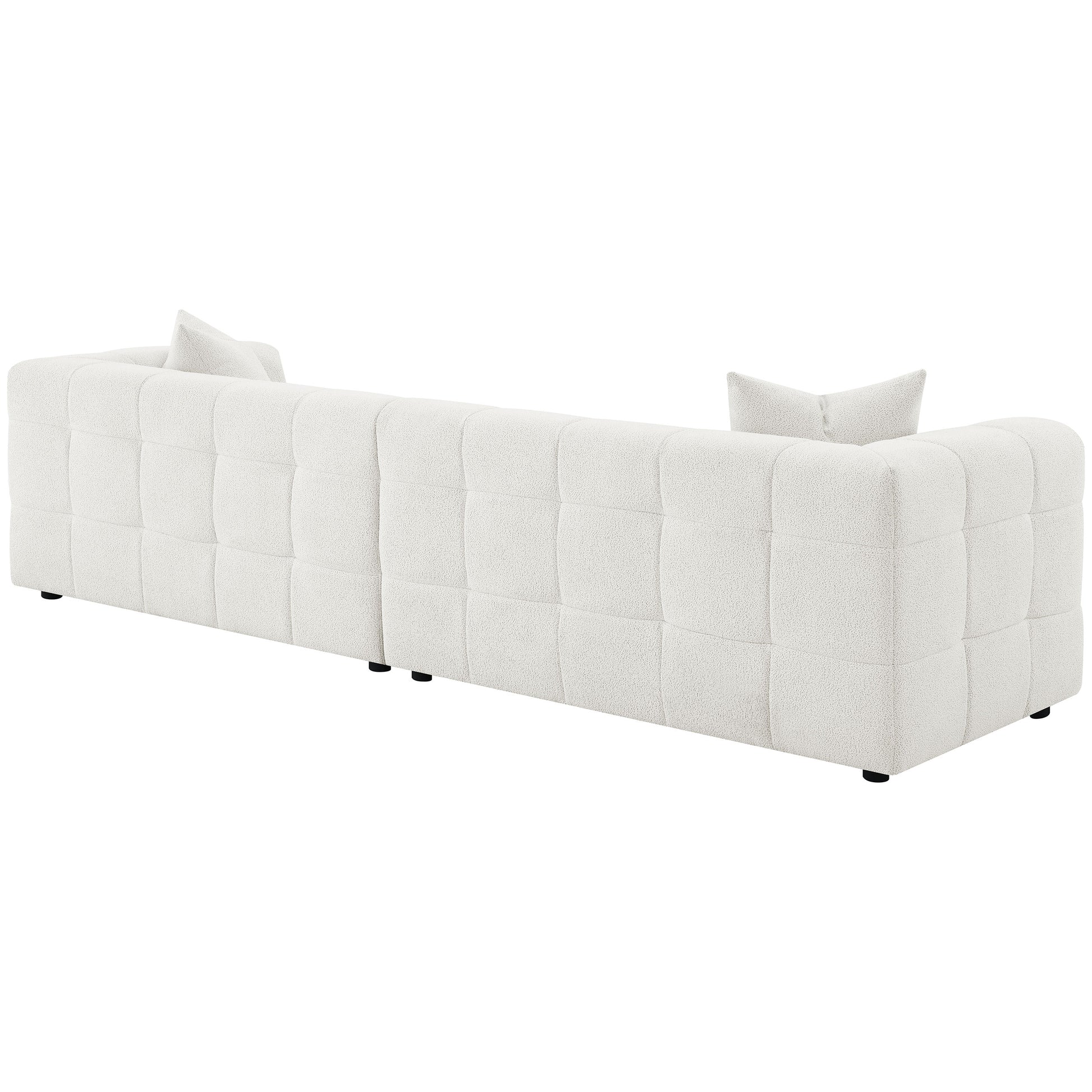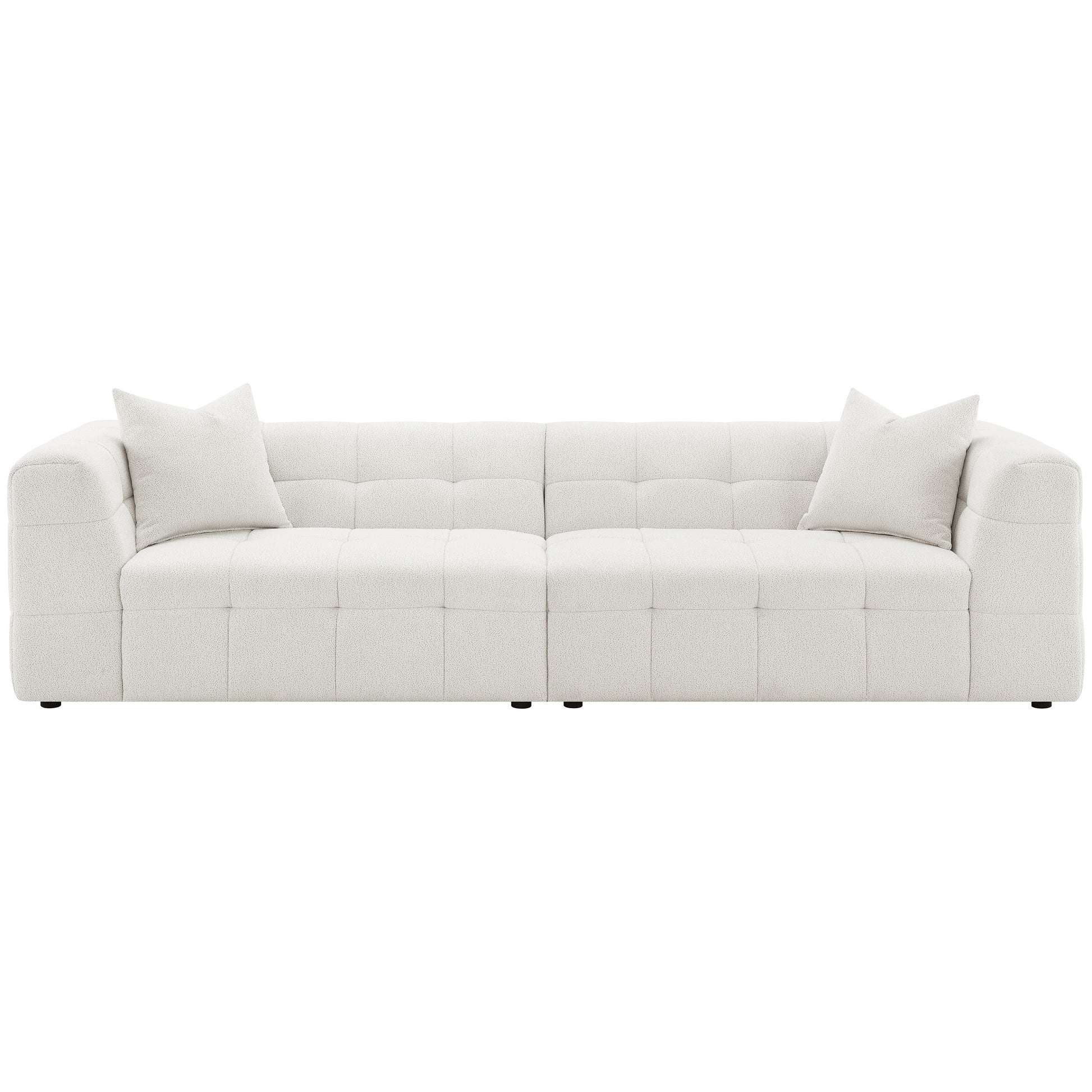 Introduce a touch of playful sophistication to your living space with this extra long 114-inch sofa. Designed for those who appreciate both style and comfort, this extra long sofa features fun geometric details, a detailed grid tufted design, and soft textured boucle upholstery. Wrapped in luxurious boucle fabric, the Sofa XL offers a plush and inviting seating experience, perfect for relaxing or entertaining. The included two pillows add an extra layer of comfort and style, making this sofa a standout piece in any room. Pair it perfectly with a reversible and functional ottoman to complete the ultimate lounging setup.