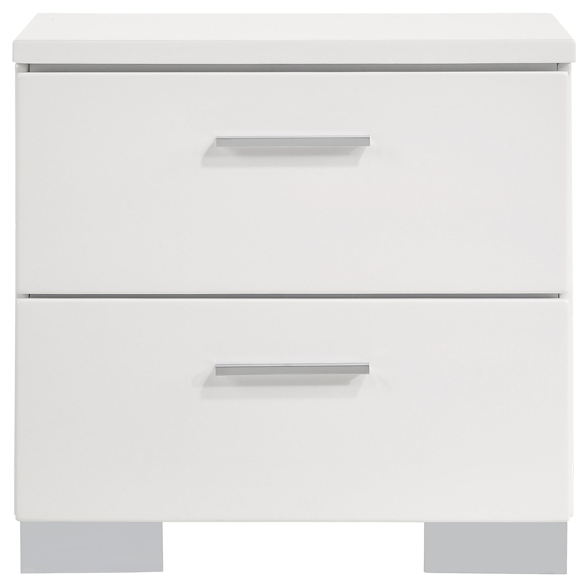 Elevate your bedroom with the sleek sophistication of this contemporary bedroom set. The panel bed features a clean-lined white high gloss headboard and a faux leather upholstered frame, delivering a refined yet modern aesthetic. Chrome-finished accents add a polished touch, while smooth-gliding drawers ensure effortless functionality. Designed for both style and durability, this set brings a fresh, minimalist feel to any space.