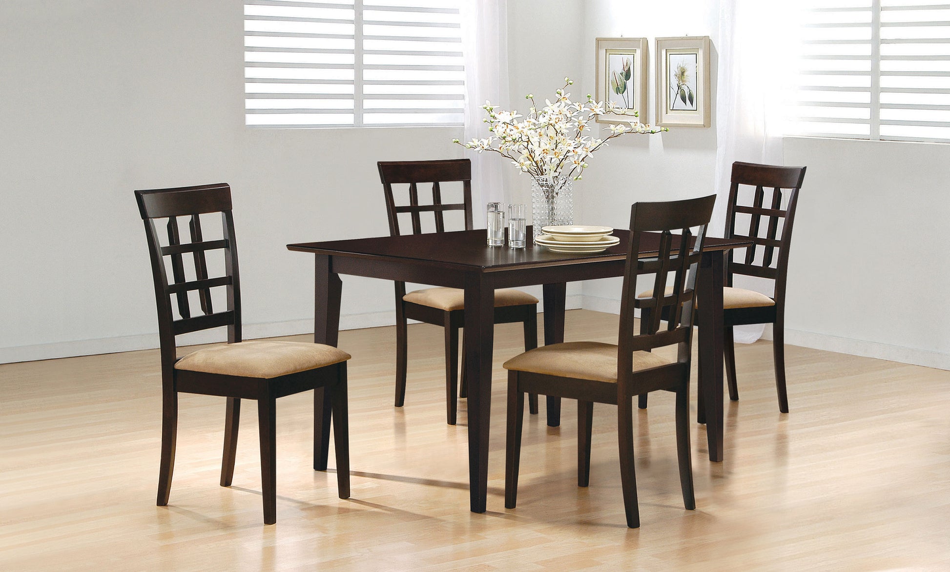 Bring timeless elegance to your dining space with this five-piece set featuring a 59-inch rectangular table and four lattice-back chairs. The table is crafted with durable hardwood, engineered wood, and okume veneer in a rich cappuccino finish. The lattice-back chairs feature cushioned seats upholstered in soft tan microfiber, combining comfort and visual appeal. This set seamlessly blends classic design with modern functionality, making it perfect for intimate meals or casual gatherings.
