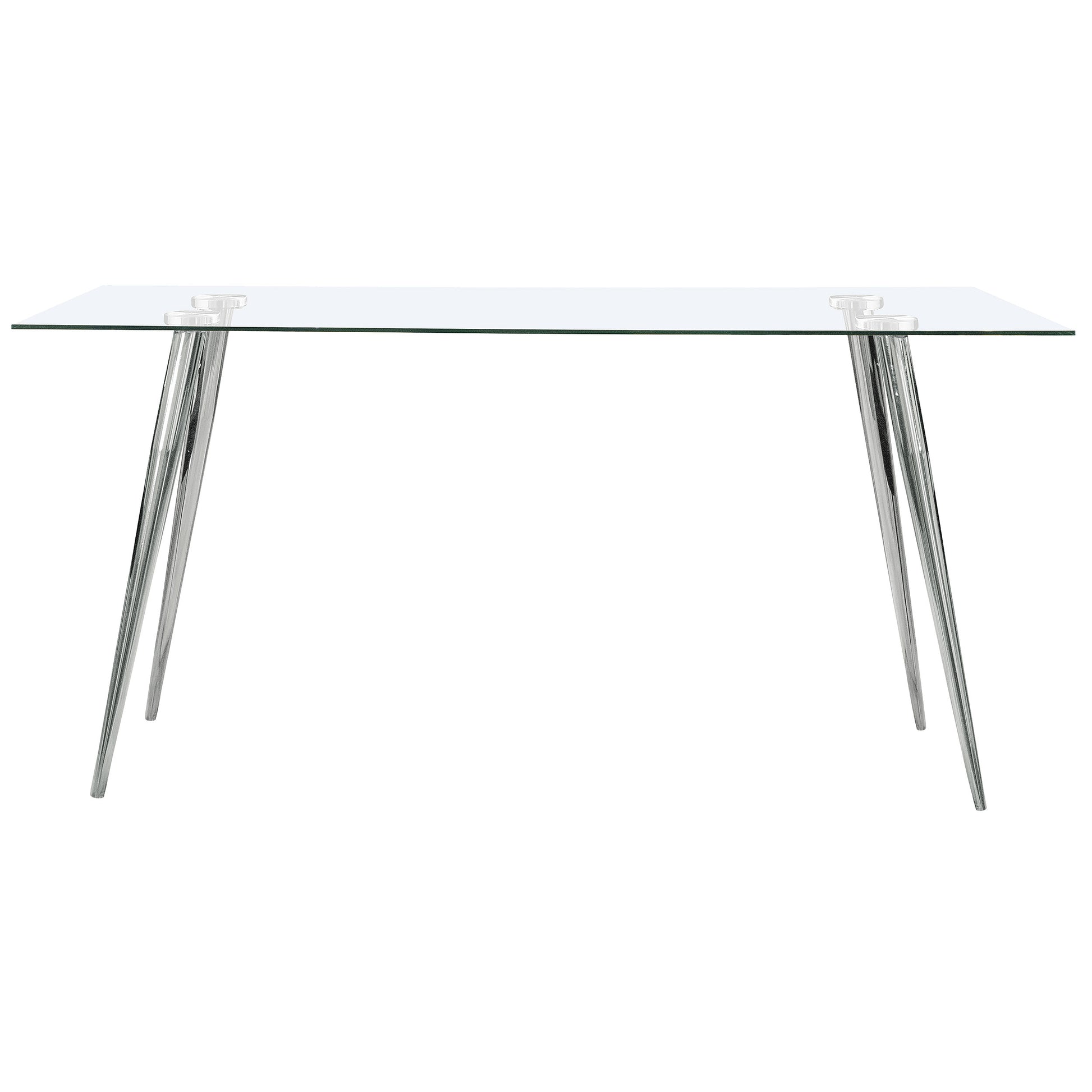 Super stylish with a mid-century modern flair, this dining table is as sleek as they come. Clean lines and an open and airy design offer a transitional twist to this dining table, making it a stunning artistic piece. A rectangular glass tabletop floats elegantly above, supported by flared and tapered legs in a lustrous metal finish add a shimmer to the space. Choose between warm or cool metal tones to tie together your existing decor and complete a space. In addition, this spacious dining table lends itself nicely to contemporary homes.