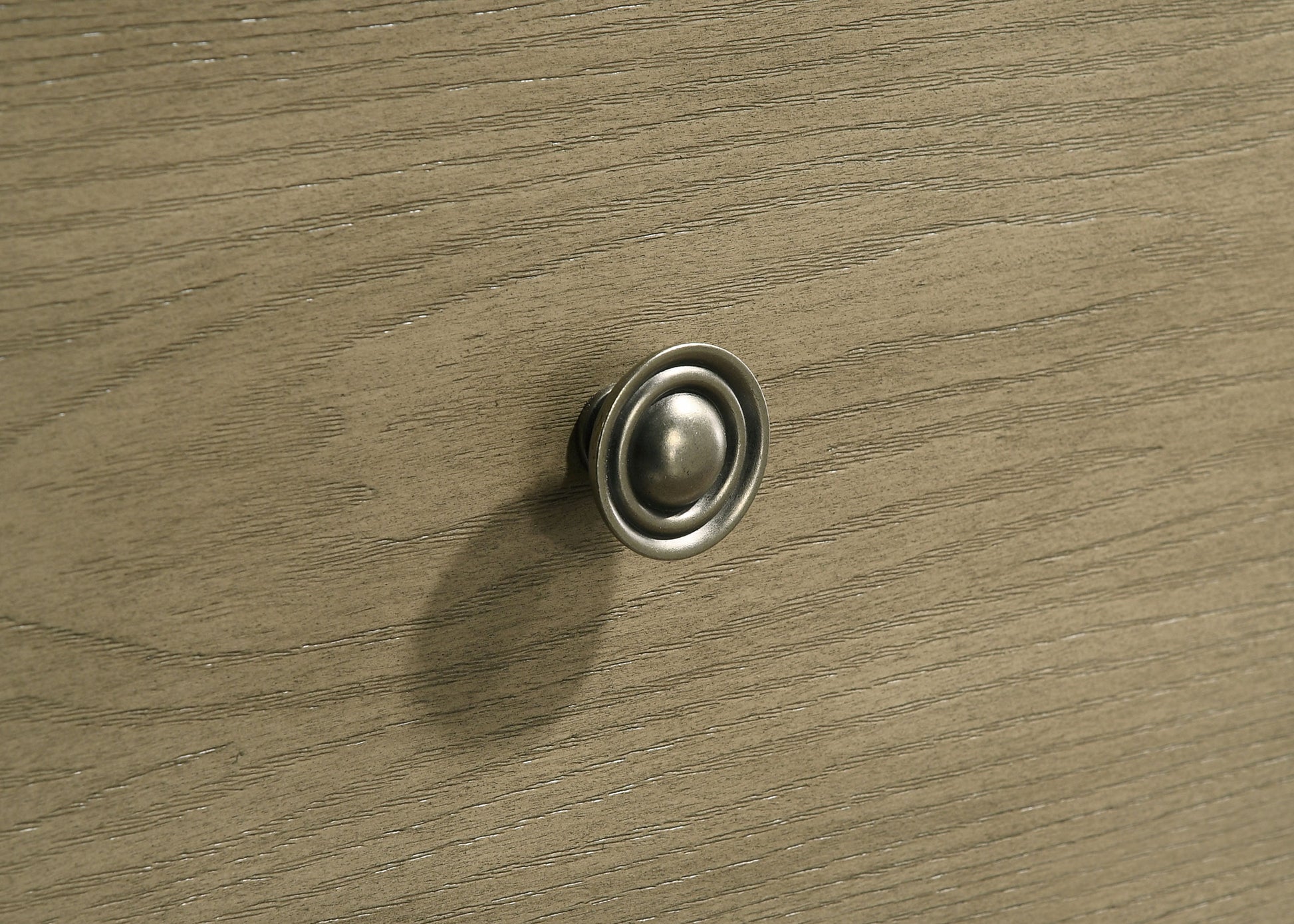 • Antique nickel metal knobs provide a refined accent against the embossed oak grain veneer