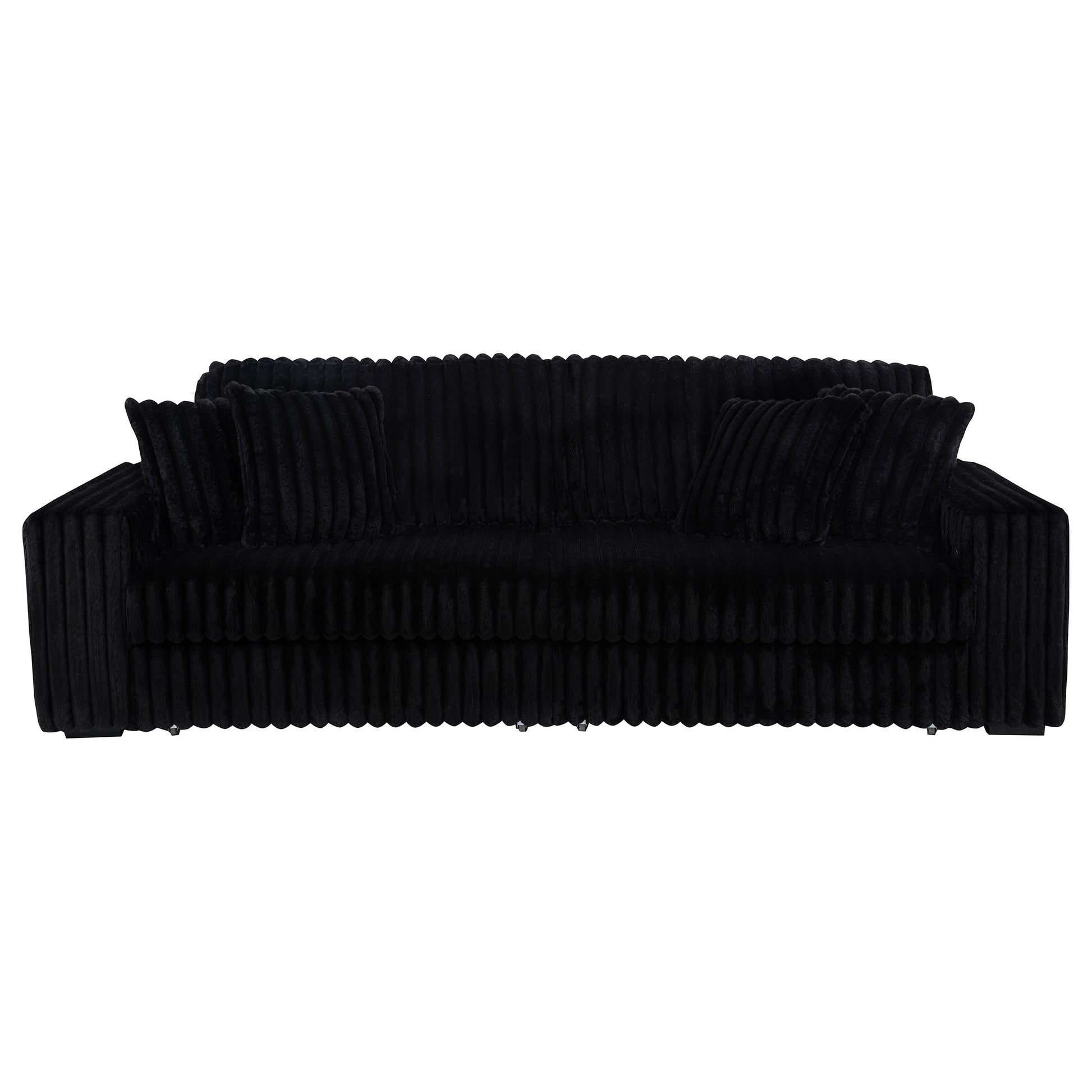 • Contemporary sofa set in black corduroy features deep channel tufting and dual power chaise design