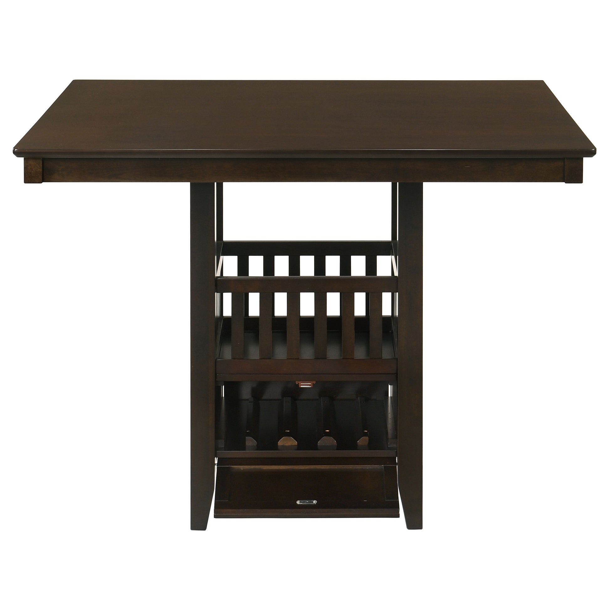 This counter height dining table brings refined style and smart functionality to any dining area. Its square silhouette and rich espresso finish create a sophisticated look that blends beautifully with transitional décor. A slatted pedestal base adds visual interest while offering built-in storage, including a wine glass rack and concealed compartment for bottles or accessories. Crafted from rubberwood, engineered wood, and okume veneer, this table combines timeless elegance with everyday practicality.