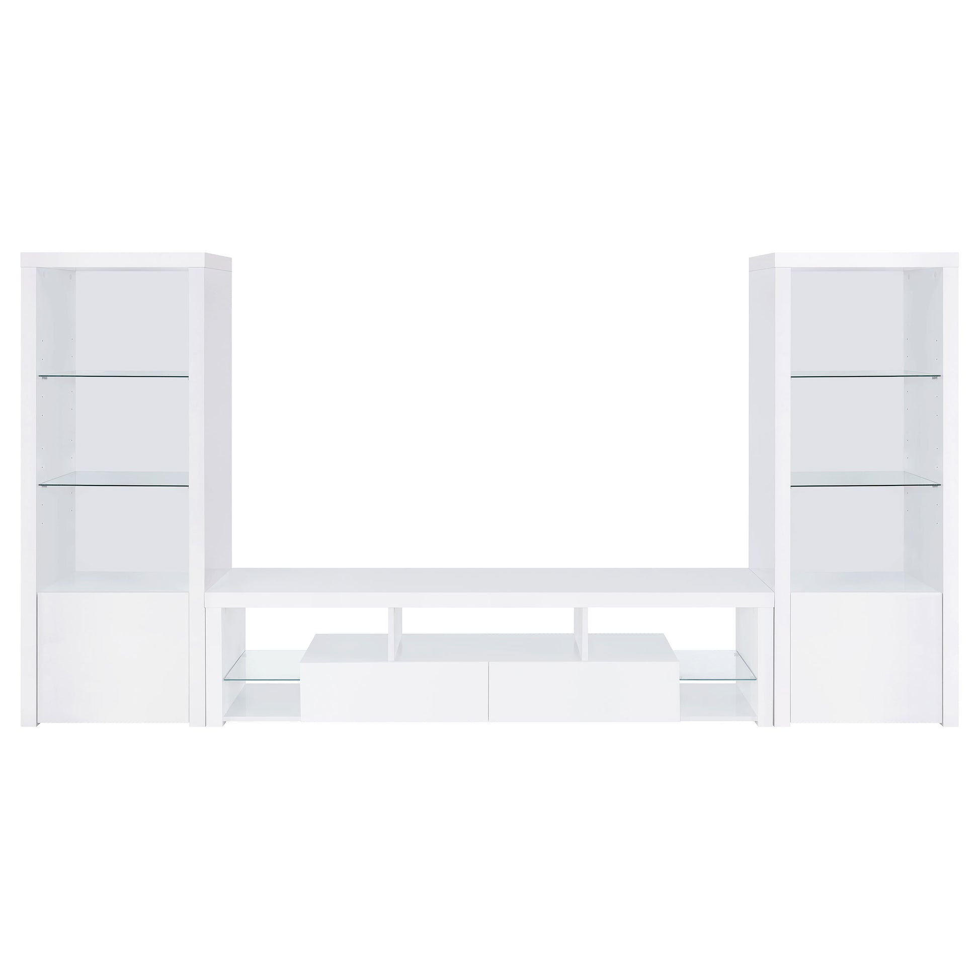 Elevate your entertainment arena with our sleek, modern TV stand. Drenched in a pristine glossy white-on-white finish, it radiates sophistication, accentuated by clear glass details. Its soft-close drawers ensure smooth operation, while glass shelves present a chic display option. Generous storage compartments cater to all your media needs. To enhance the ensemble, the set comes with matching media towers, amplifying storage capacity and offering a unified, stylish appearance. This combo not only meets functional demands but also serves as a captivating focal point in any contemporary space.