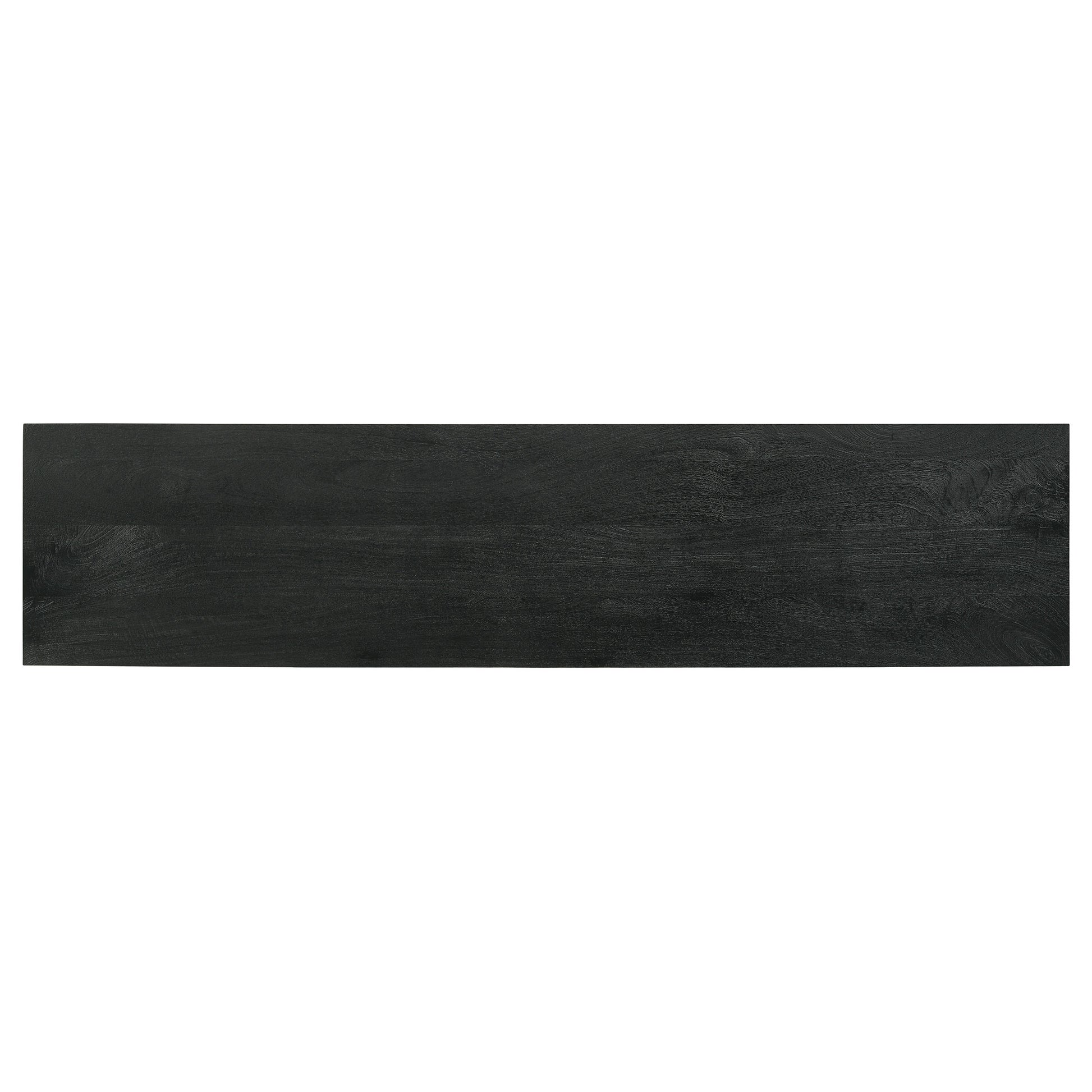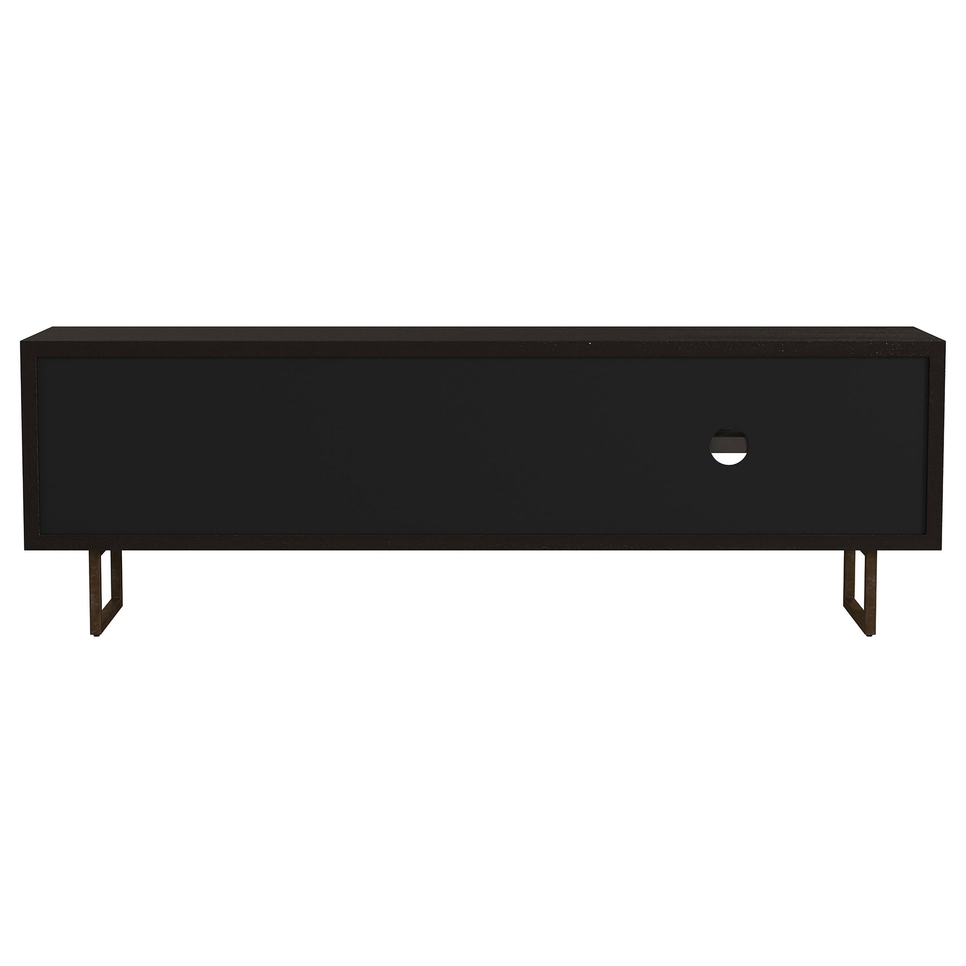A dramatic charcoal black finish coats wood products construction, adding a bold look to this casual yet elegant TV stand. Gather entertainment-related gear and organize it in this tasteful stand built of mango wood with a rustic aesthetic. Set atop black finish iron bracket legs, it creates a sturdy venue for a large flat-screen TV. Components find room in two side compartments, as incidentals and media may be stashed on a fixed shelf behind two side doors with ornate iron hardware. Avoid clutter with a pre-cut wire management hole.