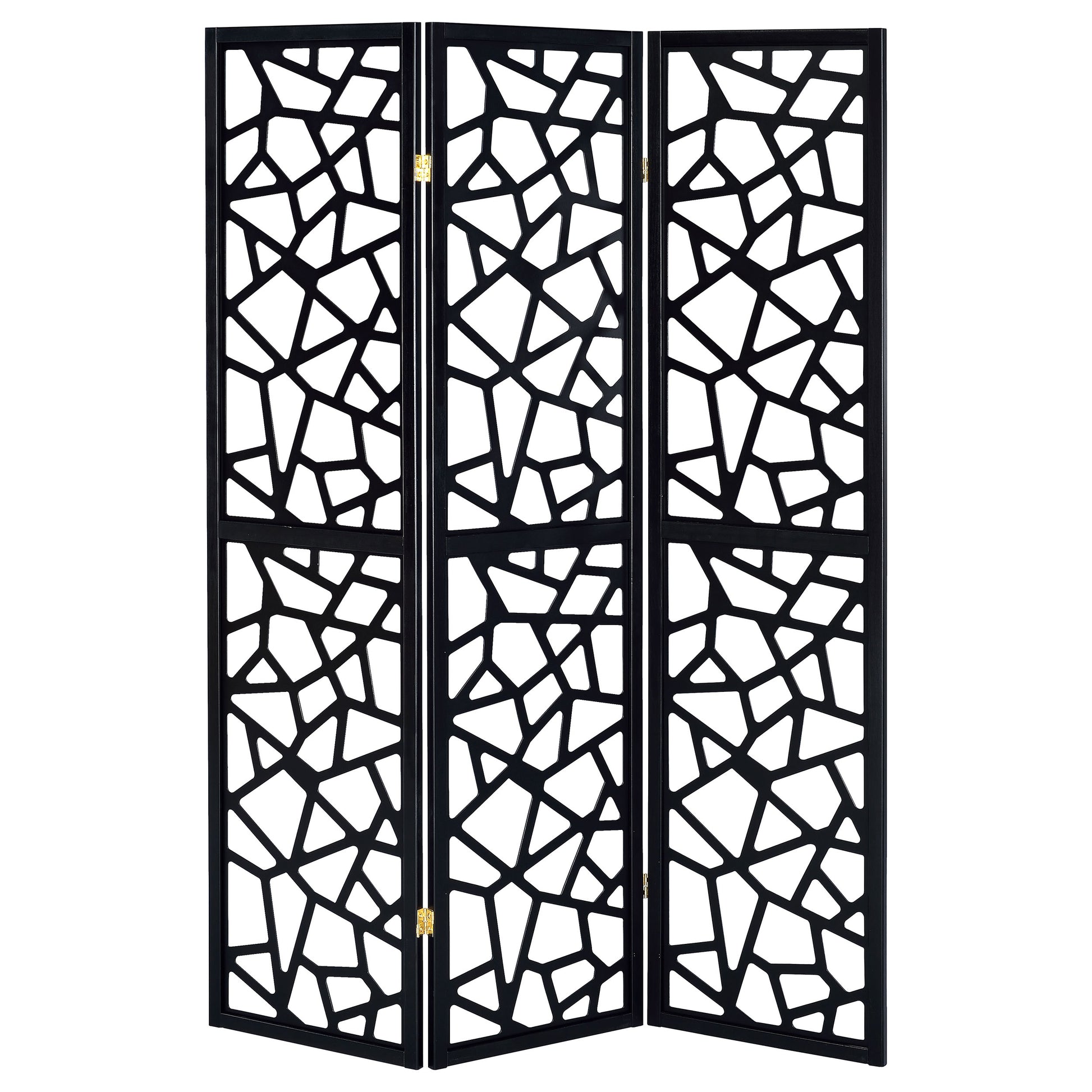 Make a bold statement in any space with this 3-panel room divider, featuring an eye-catching mosaic cutout pattern that enhances modern and mid-century décor. The sleek black finish creates a striking contrast, while the open geometric design allows light to pass through, maintaining an airy and spacious feel. Crafted with a durable solid wood frame, this partition is perfect for separating spaces, adding privacy, or serving as a decorative accent. Its folding trifold design offers versatility, making it easy to reposition as needed.