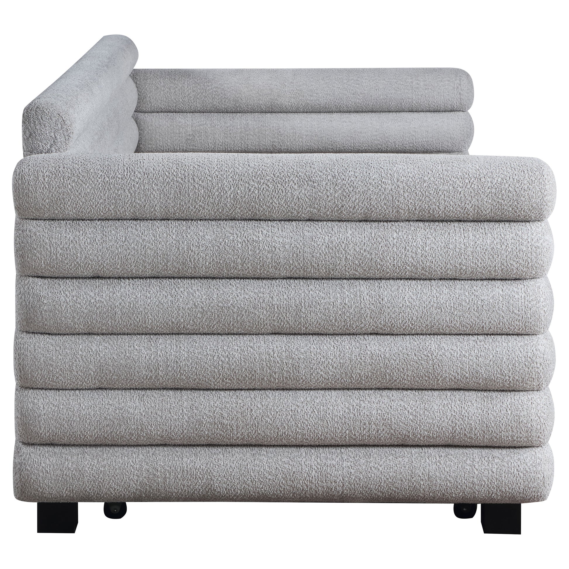 You're going to love the intriguing silhouette and boucle upholstery featured on this modern daybed and trundle. Offering contemporary flair, the daybed is designed with layered round bolsters, creating exceptional texture and dimensionality in your living room or den. Boucle upholstery is fresh and modern, creating inviting texture and character. The bed and trundle are twin-sized, offering easy lounging on a daily basis, or creating space for a pair of overnight guests. This stylish daybed offers the perfect combination of impressive style and wonderful versatility.