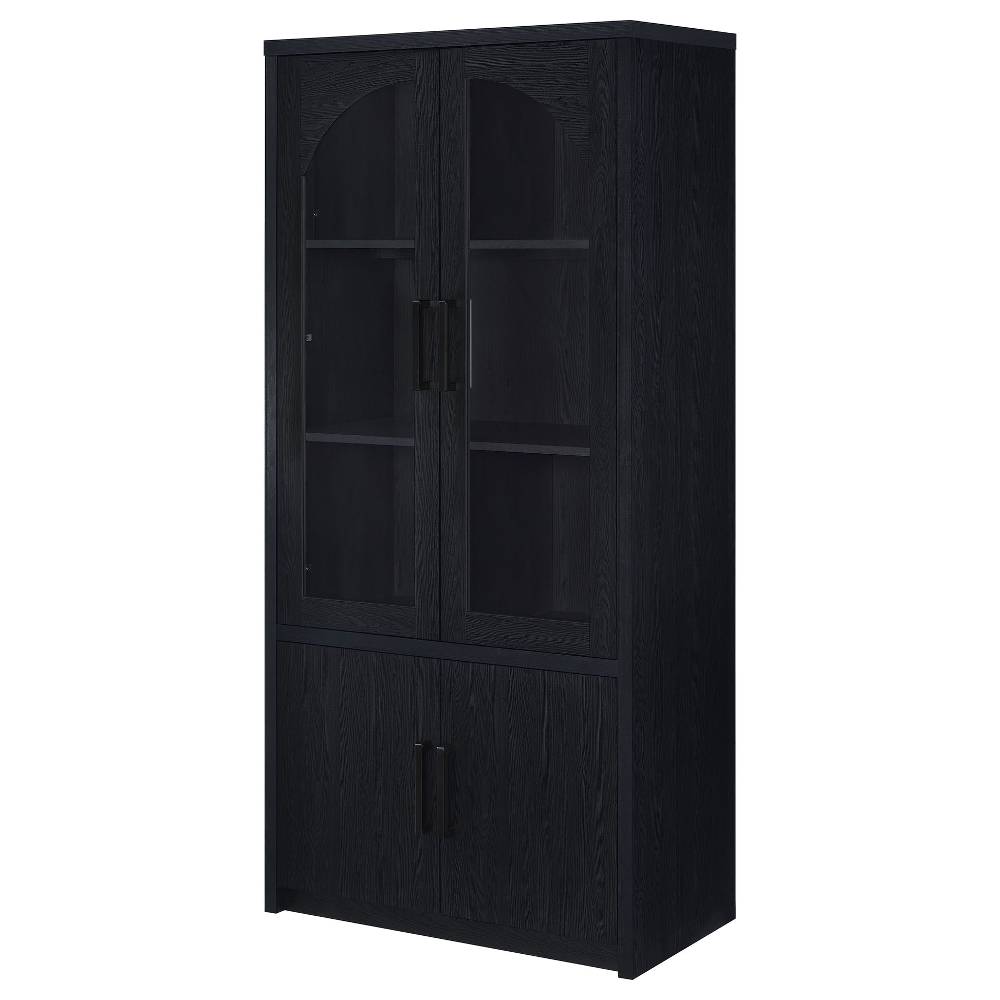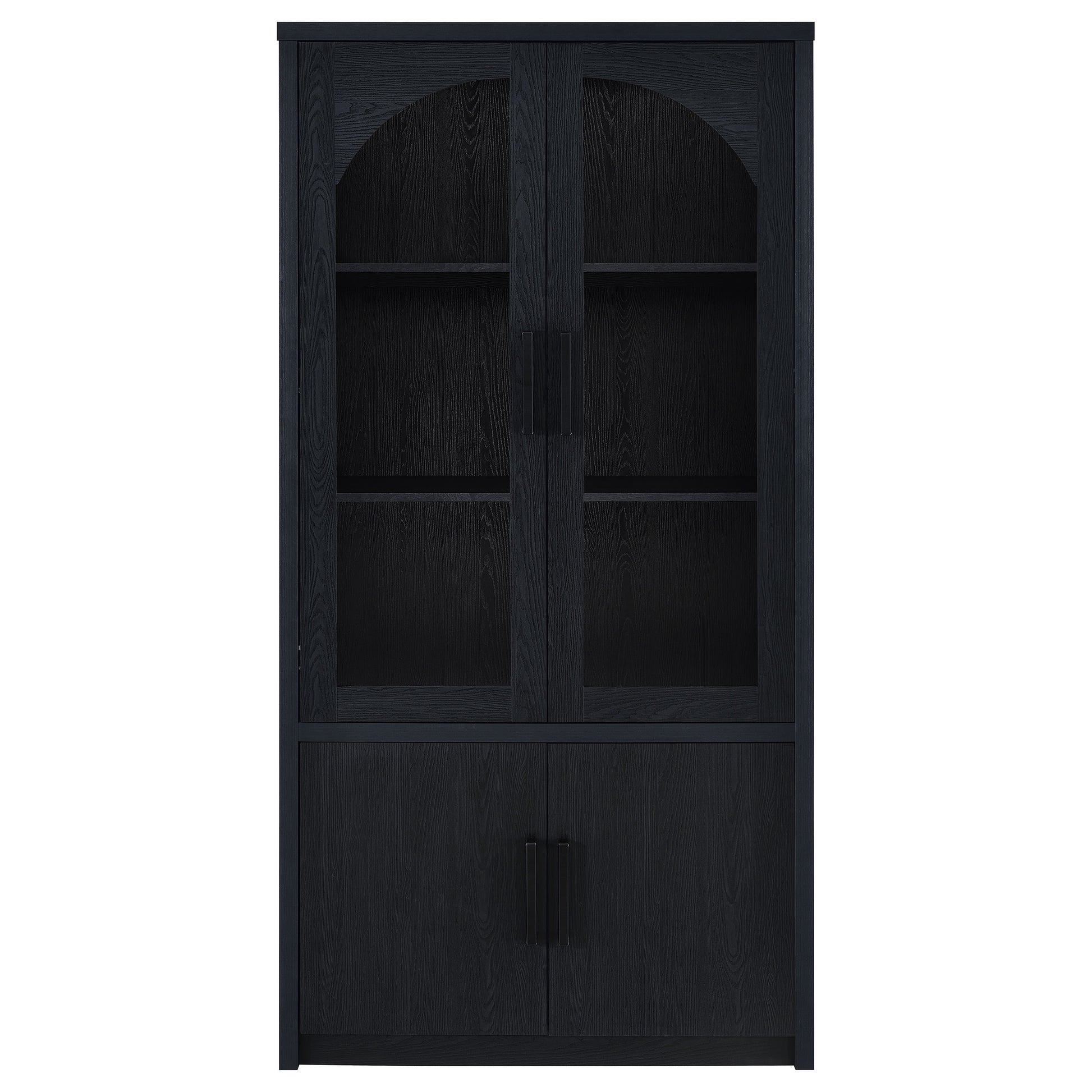 A dramatic silhouette and graceful arches come together in this striking display cabinet, where elegance meets purpose. Tall framed glass doors open to reveal a softly illuminated stage, casting warm light across treasured pieces. Below, concealed storage offers hidden utility behind panel doors, each compartment thoughtfully fitted with adjustable shelves. Cloaked in a deep black woodgrain, this cabinet brings quiet drama and timeless refinement to any curated space.
