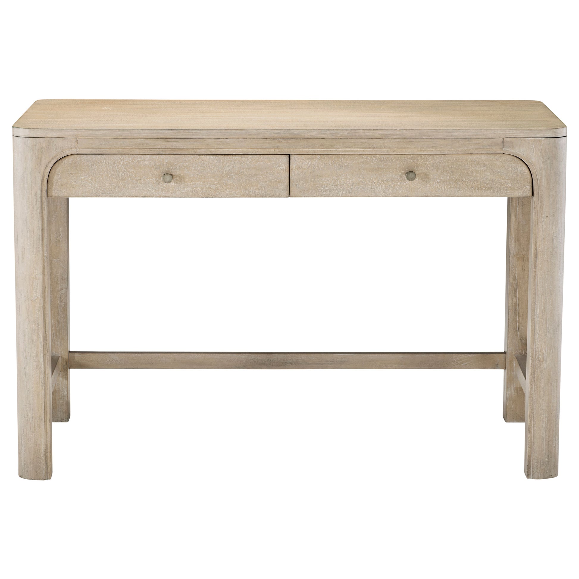Graceful form meets refined function in this two-drawer vanity desk, designed as both a writing surface and makeup table. Sculpted legs and rounded corners soften the silhouette, while two felt-lined drawers keep beauty tools or daily essentials neatly stored. Finished in weathered mango, its surface reveals natural wood grain. Built from mahogany, engineered wood, and mango veneer, it brings elegance to any bedroom or dressing space.
