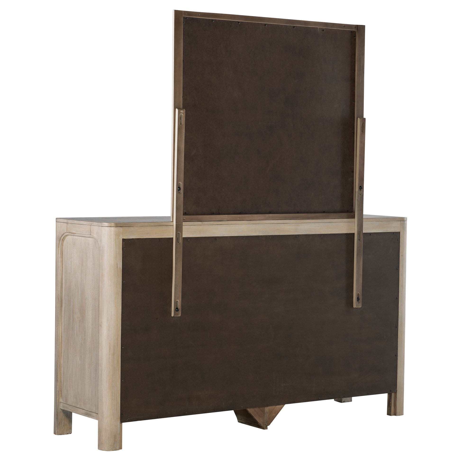 With its broad frame and softened curves, this dresser and mirror set radiates quiet confidence and poise. Sculpted edges flow gracefully around nine generous drawers, while the tall mirror reflects light and space with understated beauty. A hidden jewelry tray in the top drawer adds a thoughtful touch of luxury. Designed to bring harmony and order, this piece is both a centerpiece and a sanctuary for daily rituals.