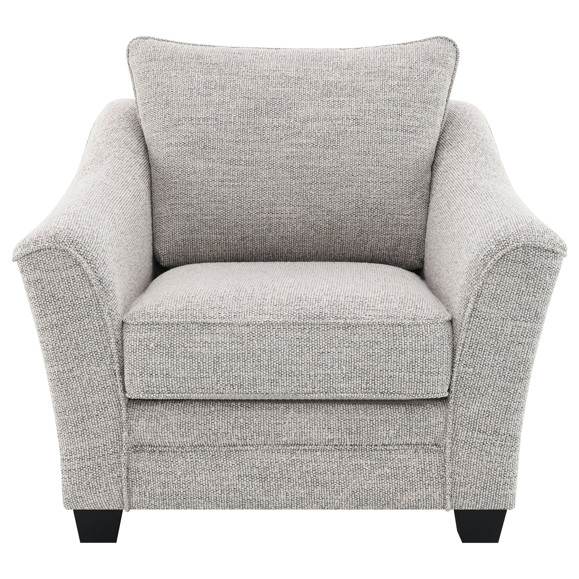 Cozy up in this well-tailored modern accent armchair, perfect for a living room seating area. The chair boasts a textured boucle fabric, offering impeccable texture and on-trend appeal, perfect for camouflaging wear. Its sloped arms, reminiscent of a chic profile, and boxed seat cushions provide an inviting look and feel, enhanced by tall back pillows all finished with welt trim. The chair sits on tall block legs, providing a sturdy foundation and a dark finish that completes the look. These legs include plastic glides that protect floors, ensuring the chair is not only stylish but also practical.