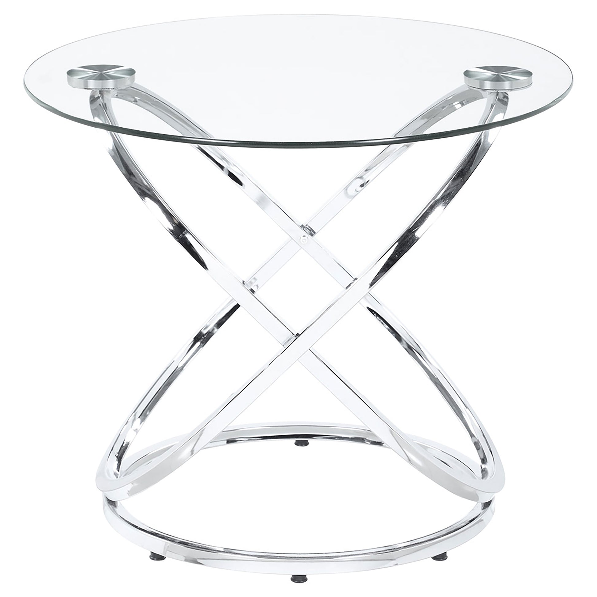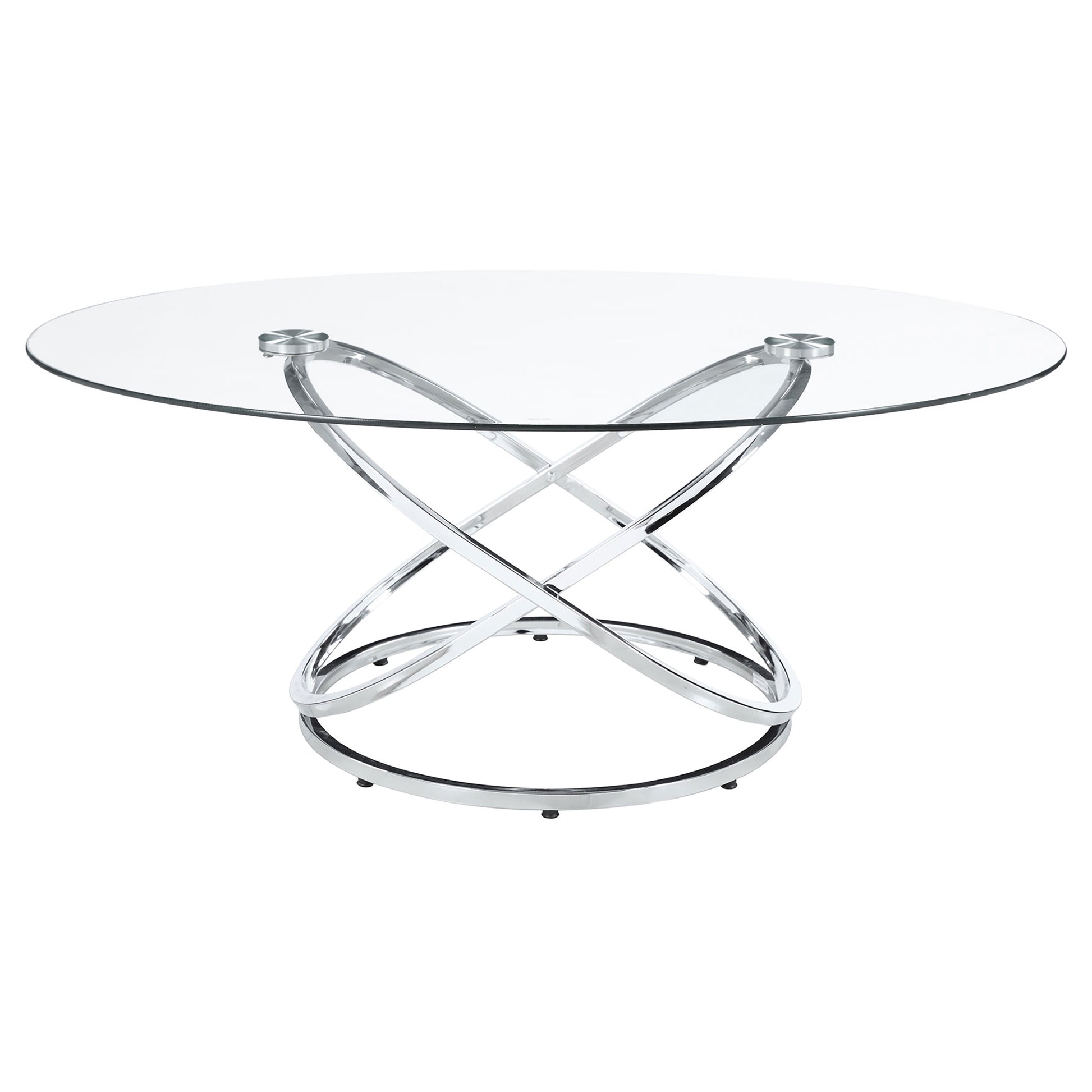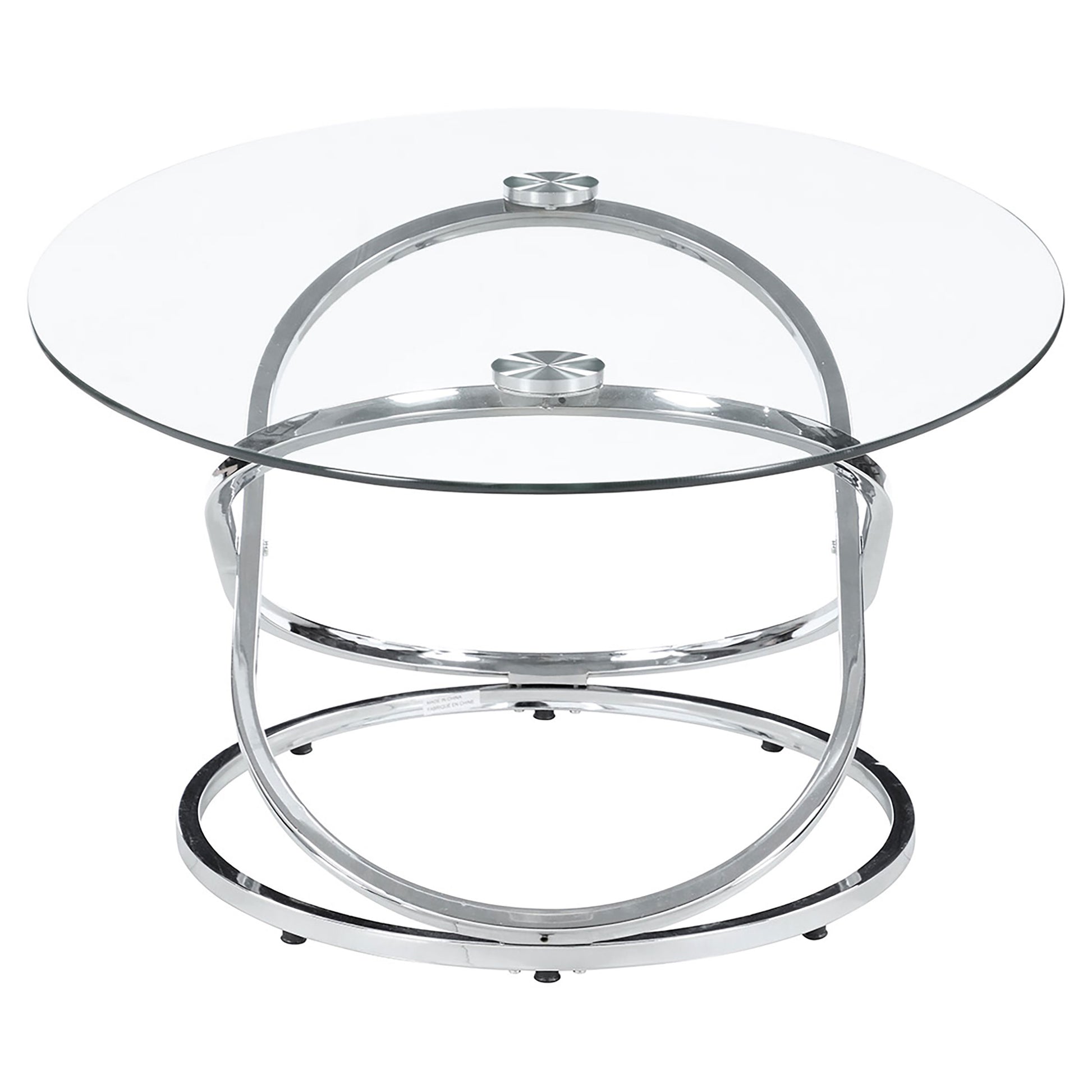 This striking coffee table set includes a cocktail table and two matching side tables, perfect for modern living spaces. Featuring clear tempered glass tops, these tables exude elegance and durability. The bases showcase polished chrome-finished metal in an intertwined ring design, adding a touch of contemporary flair. The open framework enhances visual lightness, making the set ideal for smaller spaces. Designed for style and functionality, this set is a versatile addition to any room.